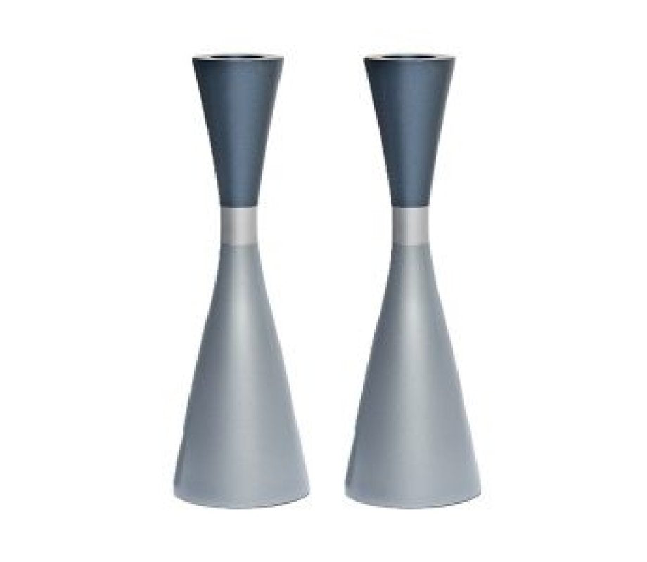 Elegance and tradition meet with these contemporary style anodized aluminum candlesticks from Yair Emanuel. The striking cone shape features an attractive two tones of gray, joined with a silver band in the center. Use with joy each week to welcome the Shabbat to your home.