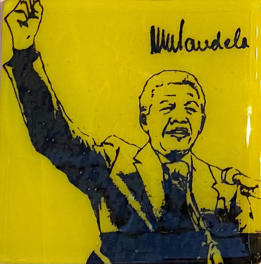 4x4" screen printed, kilnformed glass coaster. This coaster features Nelson Mandela printed with black yellow enamel onto wispy clear-white glass, then fused in a kiln to about 1400 degrees. Each coaster has clear bumpers on the bottom to protect your surfaces.