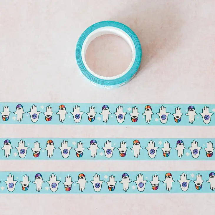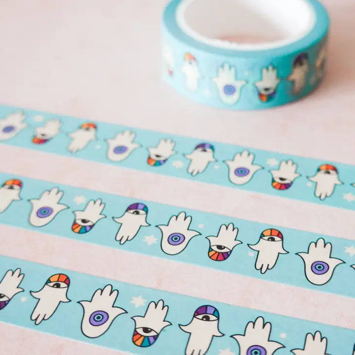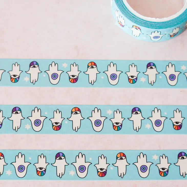 This multicolored washi tape is dotted with Evil Eyes and Hamsas, spiritual symbols of protection. These paper masking tapes are a perfect addition to your bullet journal, planner, diary, scrapbook, snail mail, & more. Washi can also be used as a masking tape for small-scale drawing and painting. They're fun to collect, and make a great gift!