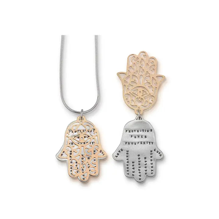 This handmade Hamsa necklace is inscribed with "Protection, Power, Prosperity, Love, Abundance, Peace, Happiness, Health, Strength, Luck"