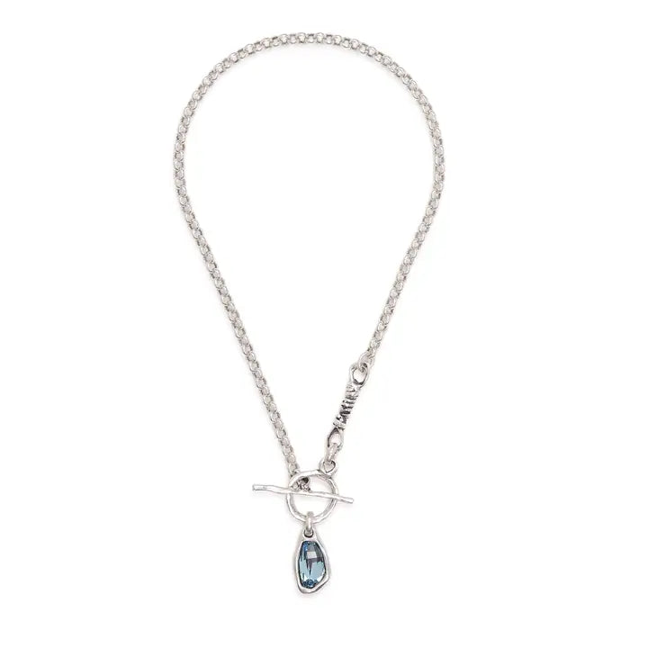 Elegant handmade pewter necklace with silver finish and blue crystal pendant.