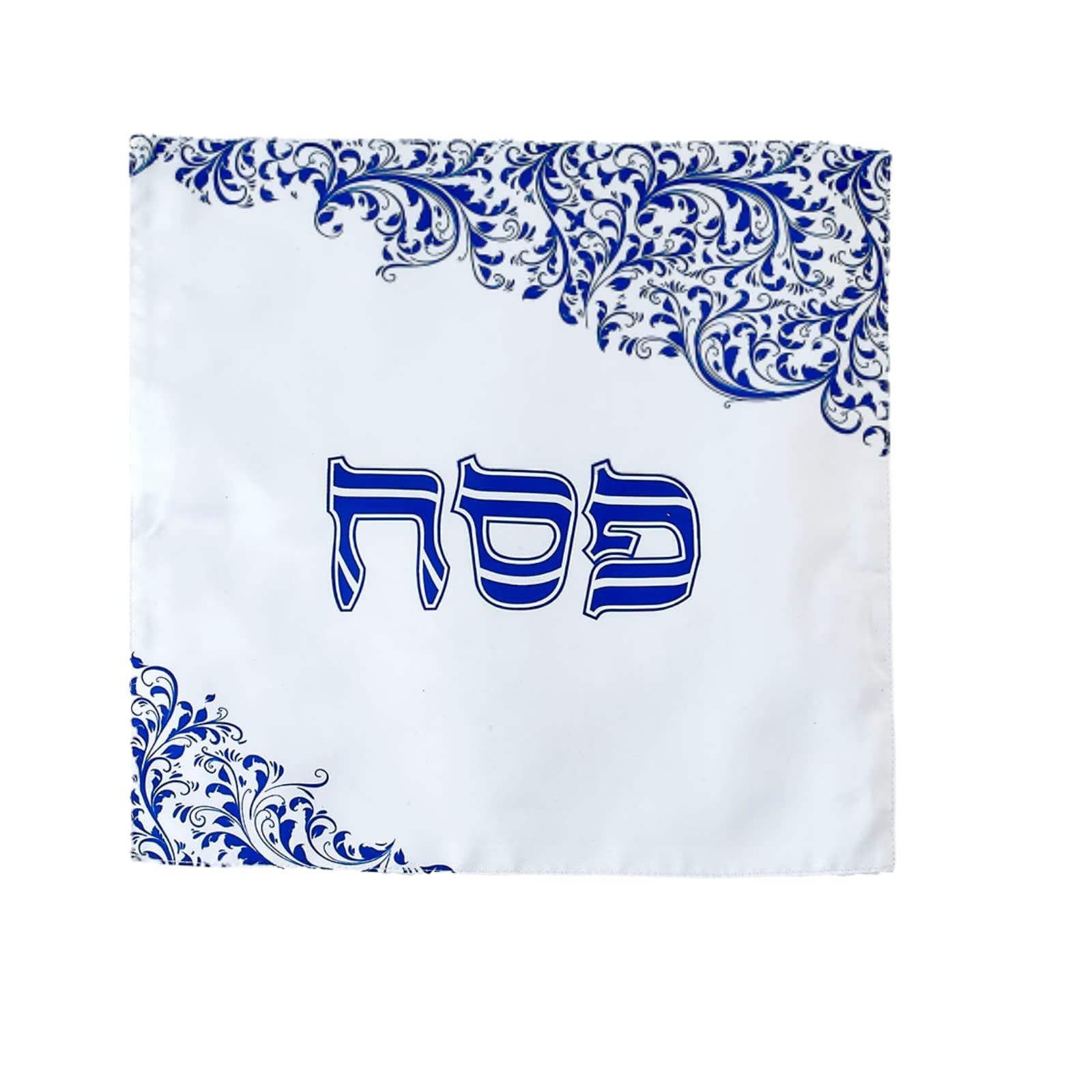 Blue and white matzah cover with hebrew lettering, perfect for a passover seder. 13 inches square.