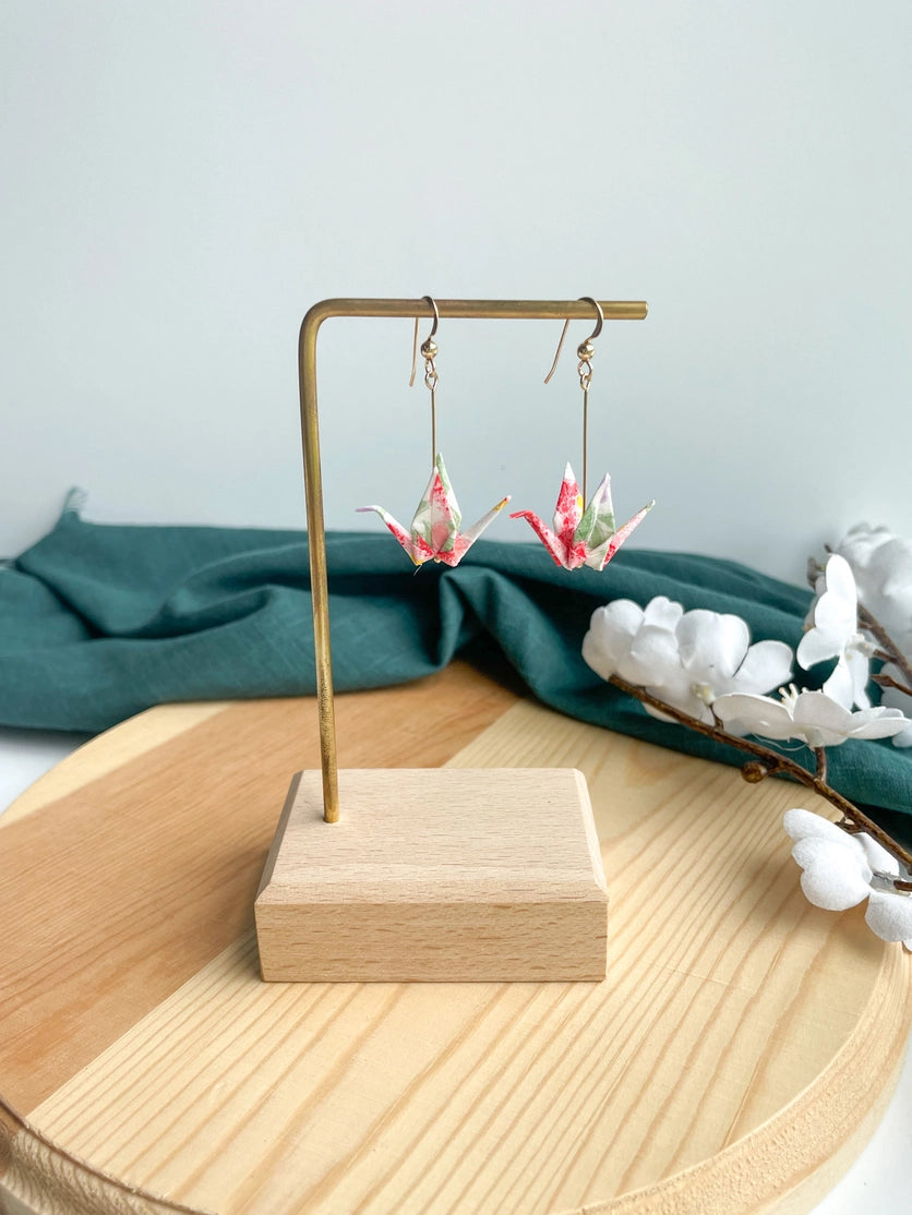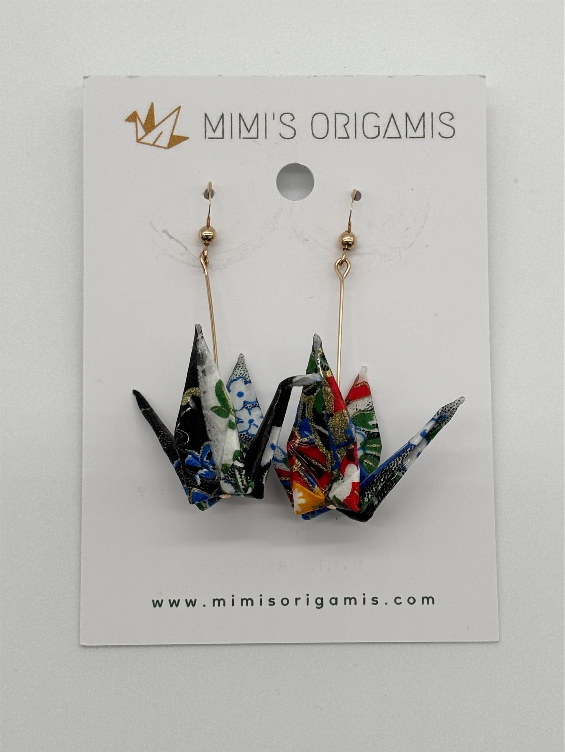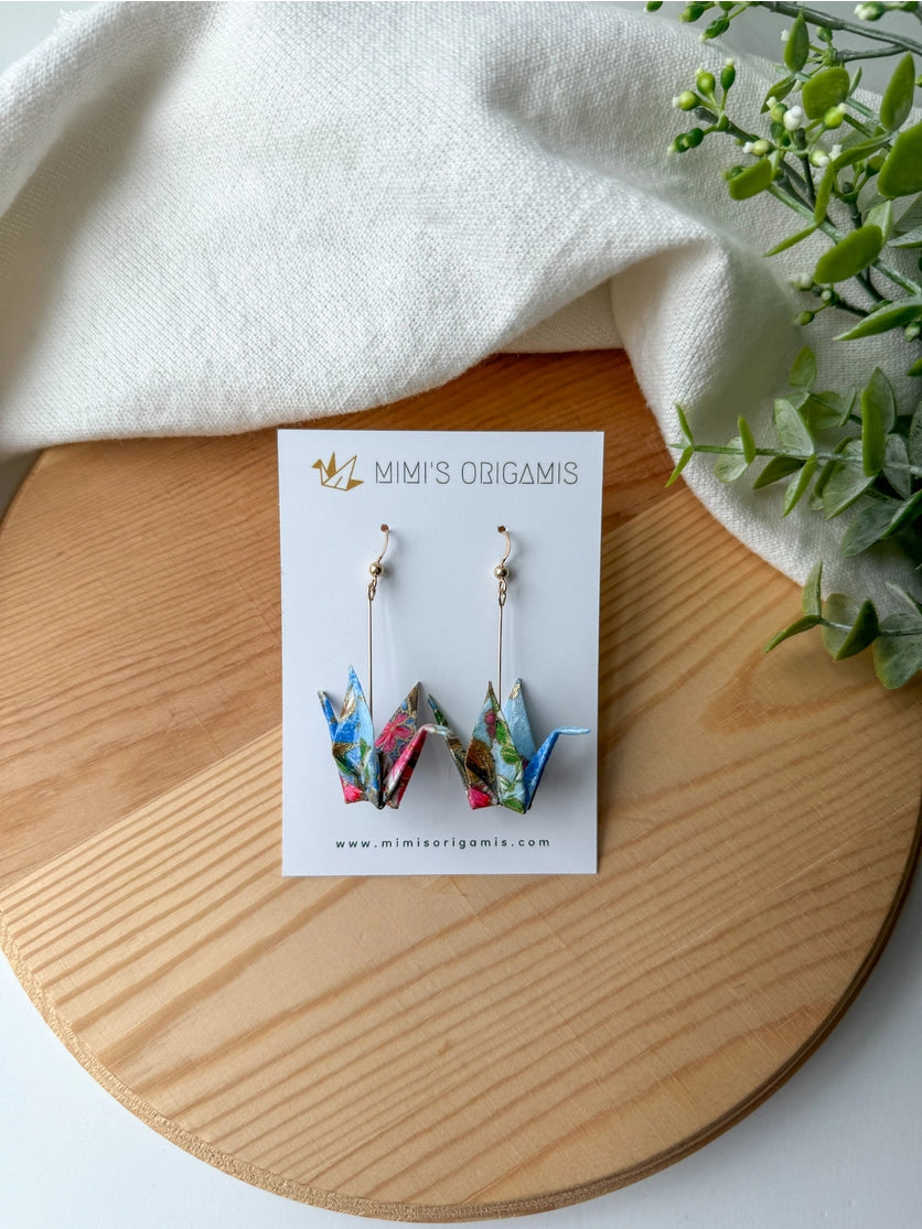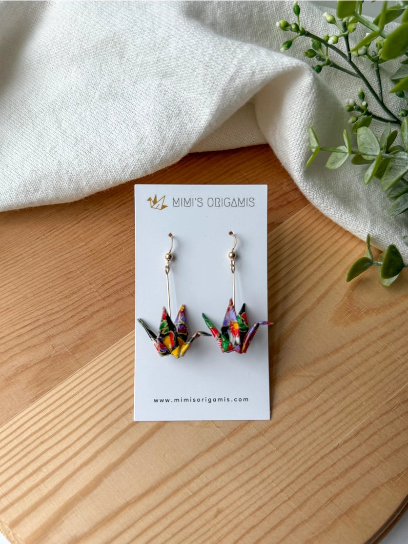 Origami cranes are hand folded with traditional Japanese washi paper (made with natural fibers) and sealed for protection. These symbolic and elegant origami cranes are paired with hypoallergenic 14K gold-filled findings to celebrate the beauty of tradition. Cranes represent good fortune, longevity, and peace in Japanese culture, so each pair is created with hopes to spread good fortune to the wearer.