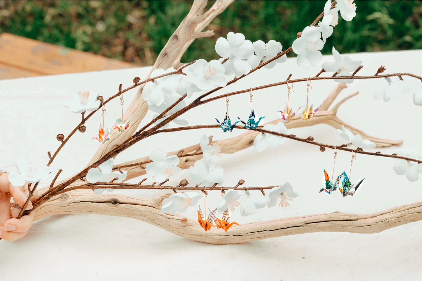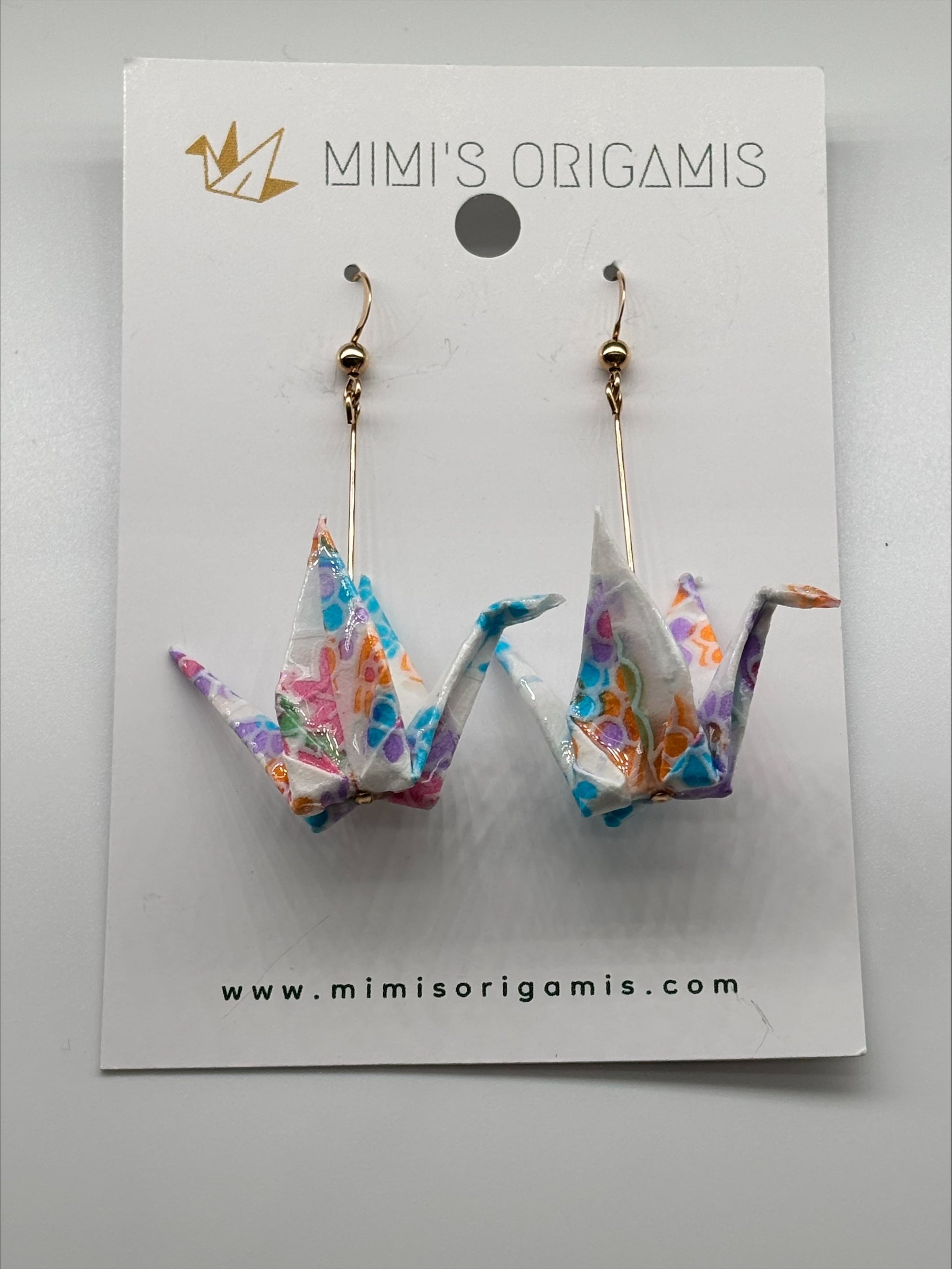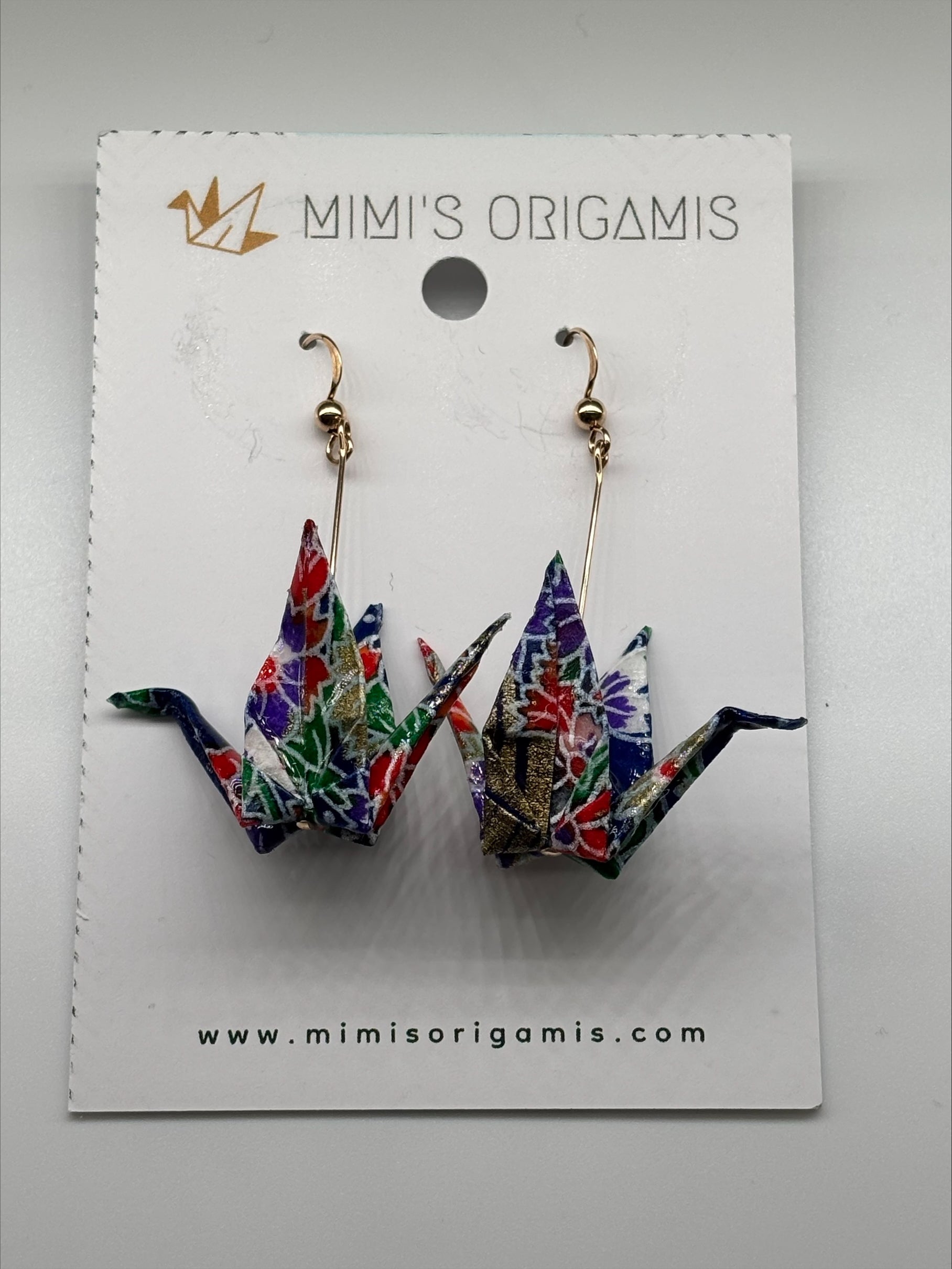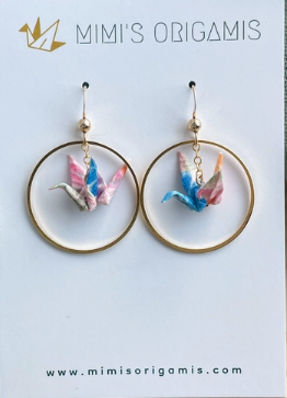 Origami cranes are hand folded with traditional Japanese washi paper (made with natural fibers) and sealed for protection. These symbolic and elegant origami cranes are paired with hypoallergenic 14K gold-filled findings to celebrate the beauty of tradition. Cranes represent good fortune, longevity, and peace in Japanese culture, so each pair is created with hopes to spread good fortune to the wearer.