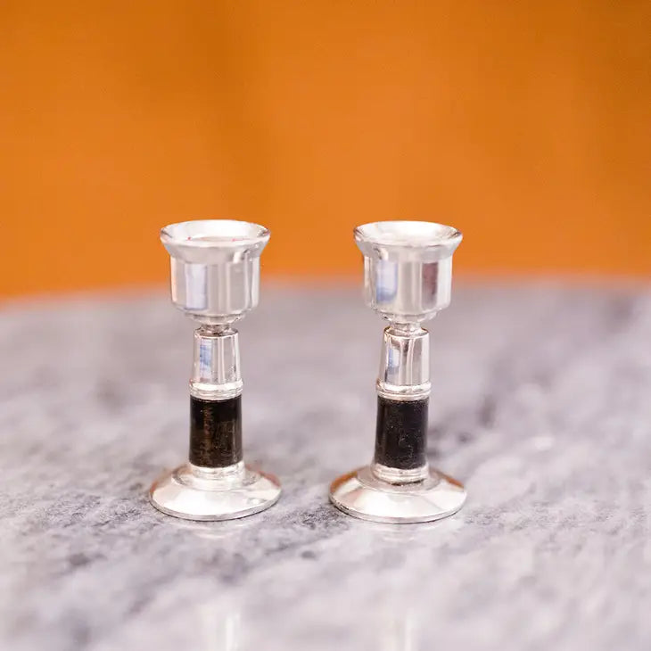 Pair of pewter taper candle holders. Each individual pewter taper holder is lovingly hand crafted using traditional techniques by a small team of artisans based just outside the heart of Cape Town. Only 100% lead free pewter is used to create these beautiful taper candle holders. The product is also approved by the South African Bureau of Standards (SABS) for quality assurance. The black band is hand painted on the base to offer contrast. The holder stands approximately 3" high. A great way to display and burn your Shabbat candles!