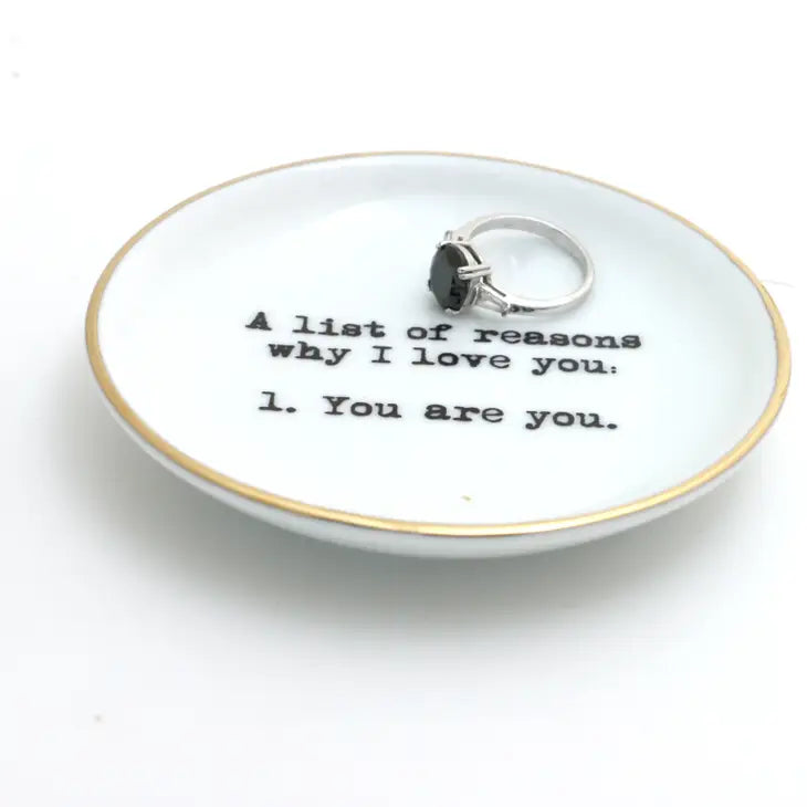 Reasons why I Love You Ring Dish. We could make a list of why you should purchase this item but all we would need to write is: 1. BECAUSE YOU LOVE THEM AND THEY WILL LOVE IT. Simple, modern and elegant this is the perfect gift for anyone you want to show appreciation to. Its a little token of thanks and love! This small round dish is the perfect place to keep rings or other trinkets while busy working. Created from porcelain clay and kiln fired numerous times. This small dish measures 4 x 4 and features a 22K gold rim.