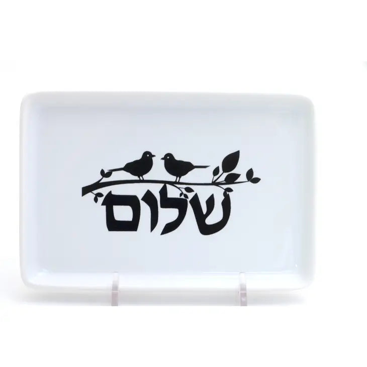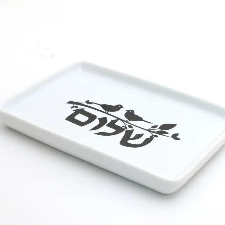 This handmade rectangular small dish reads SHALOM in Hebrew, which means peace, harmony, wholeness, completeness and prosperity. Wish someone well with this little tray which can be used for food, to hold jewelry or keys, or as a soap dish, spoonrest, or candle dish! It was created using all lead free, non toxic materials in New Jersey. It has been kiln fired to over 2000 degrees and is safe to place in your dishwasher or microwave- made to be used and enjoyed for a lifetime. Sturdy high fired stoneware will not chip easily and design will not fade with time. Measures 6 1/4 inches x 4 1/4 inches. Great engagement gift for a Jewish couple.