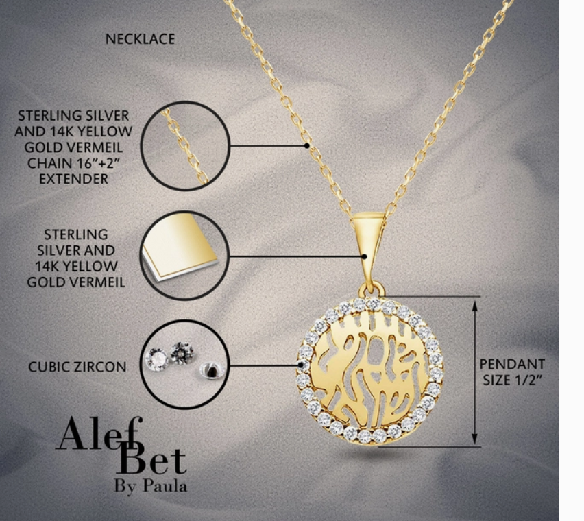Worn as a testament to one's faith, this Shema Israel Hebrew pendant is a wonderful and very personal piece of jewelry. An affirmation of one's faith and a declaration of the belief on one G-d. This meaningful charm makes a lovely gift for a birthday, Bat Mitzvah and holiday. With the Hebrew prayer written inside the round disk, the border of sparkling cubic zircon stones enhances its beauty.