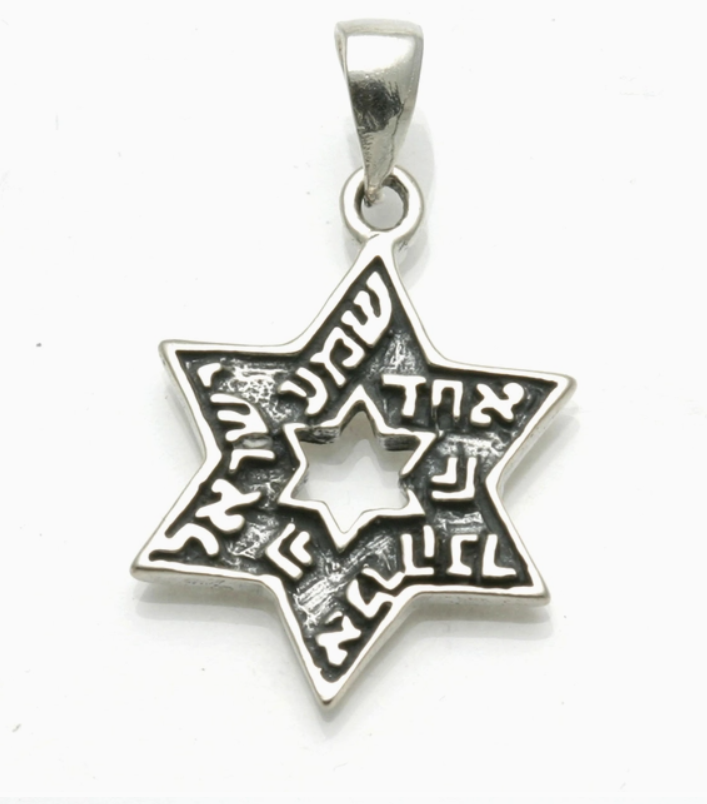 This elegant pendant is made of 925 sterling silver. Its a double Star of David with the Shema prayer written inside it. The pendant has an oxidized finish in the background which makes the letters stand out. It has a smooth flat back and is very well made.