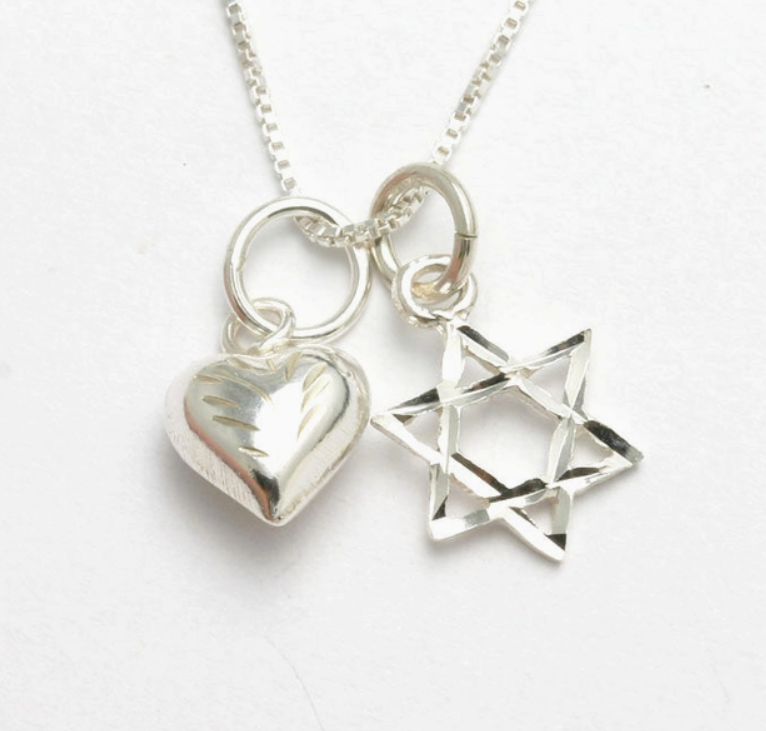 This lovely necklace is made of 925 Sterling Silver. Its a box chain with 2 charms dangling it, (1) diamond cut Star of David and (1) smooth puffed heart. This adorable necklace is a very popular Bat Mitzvah gift.