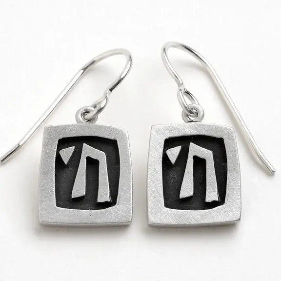 These contemporary earrings feature a rectangular silver charm with a small image of a chai on a black patinaed background and bordered by a silver frame.